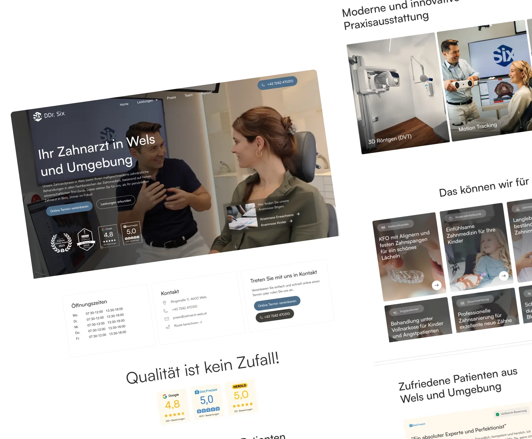 Für die Zahnarztpraxis DDr. Six in Wels haben wir einen Website-Relaunch inklusive SEO Maßnahmen umgesetzt. Ergebnisse: ⌀ 1000 Besucher /Monat, ⌀ 150 Termine / Monat, ⌀ Conversionrate insgesamt: 11,62%