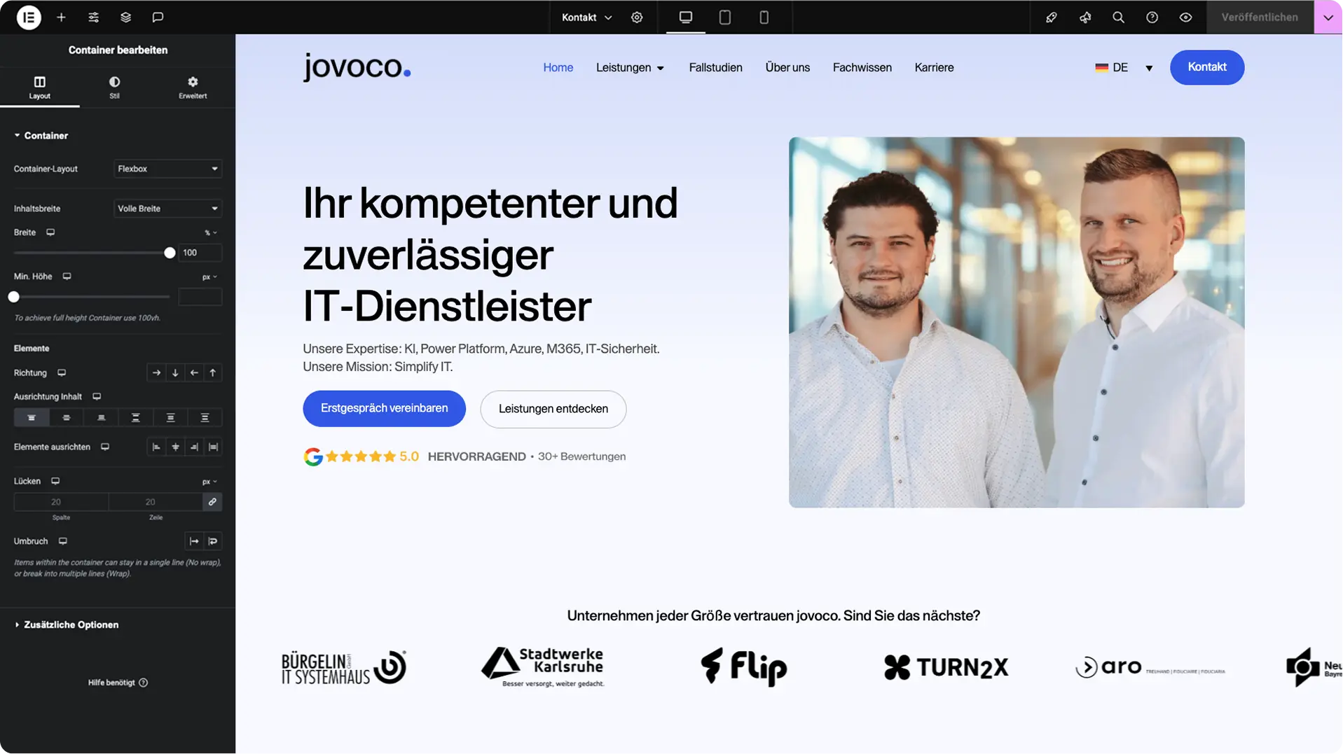 Die technische Umsetzung erfolgte in WordPress mit Elementor, optimiert für alle Endgeräte. Wir haben die Ladezeit optimiert, und umfassende Tests auf verschiedenen Browsern und End-Geräten durchgeführt. So konnten wir eine Website für jovoco erstellen, die einwandfrei läuft.