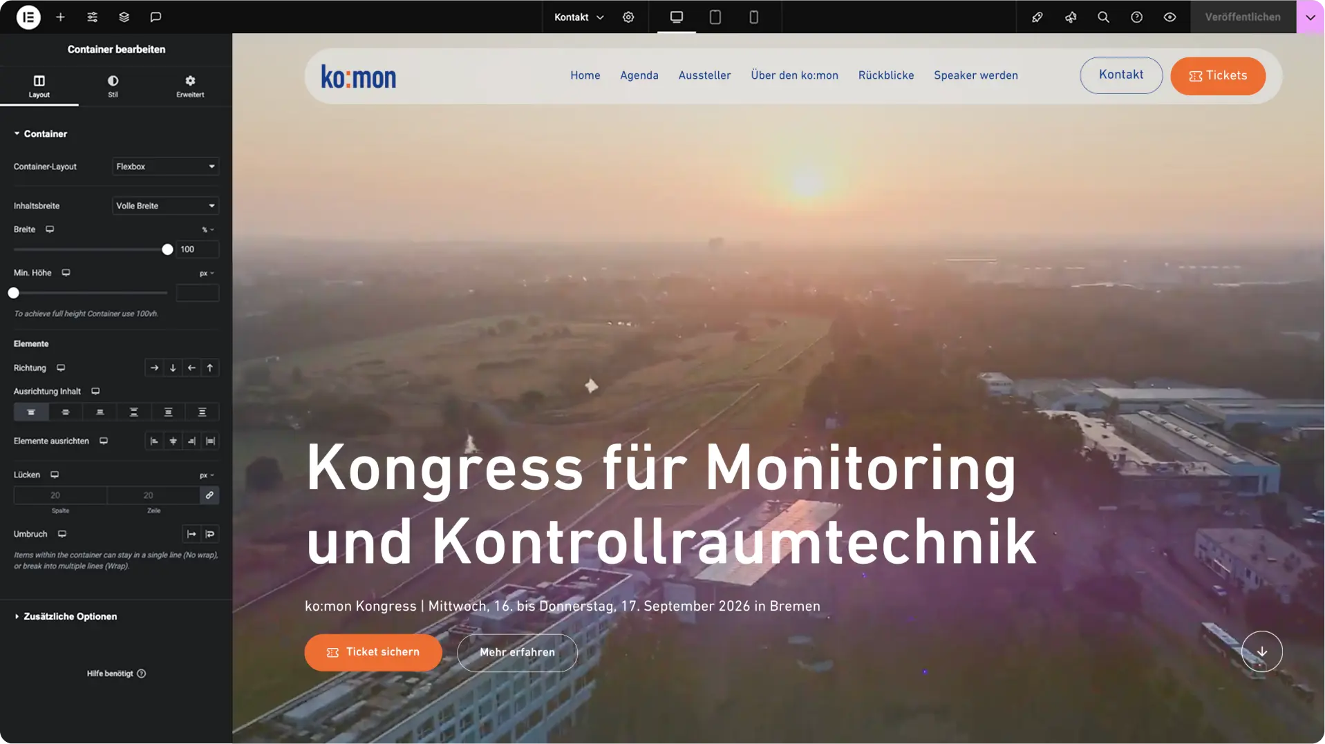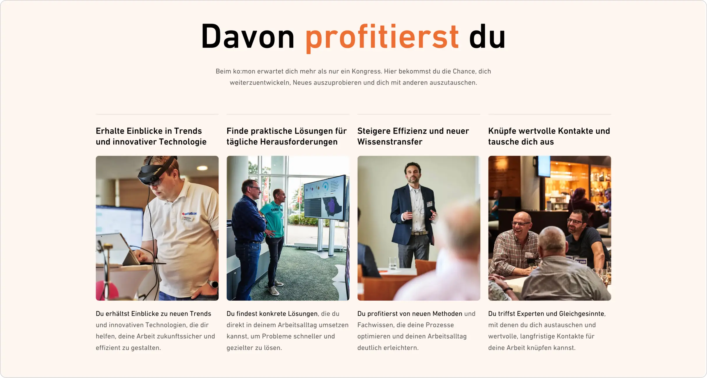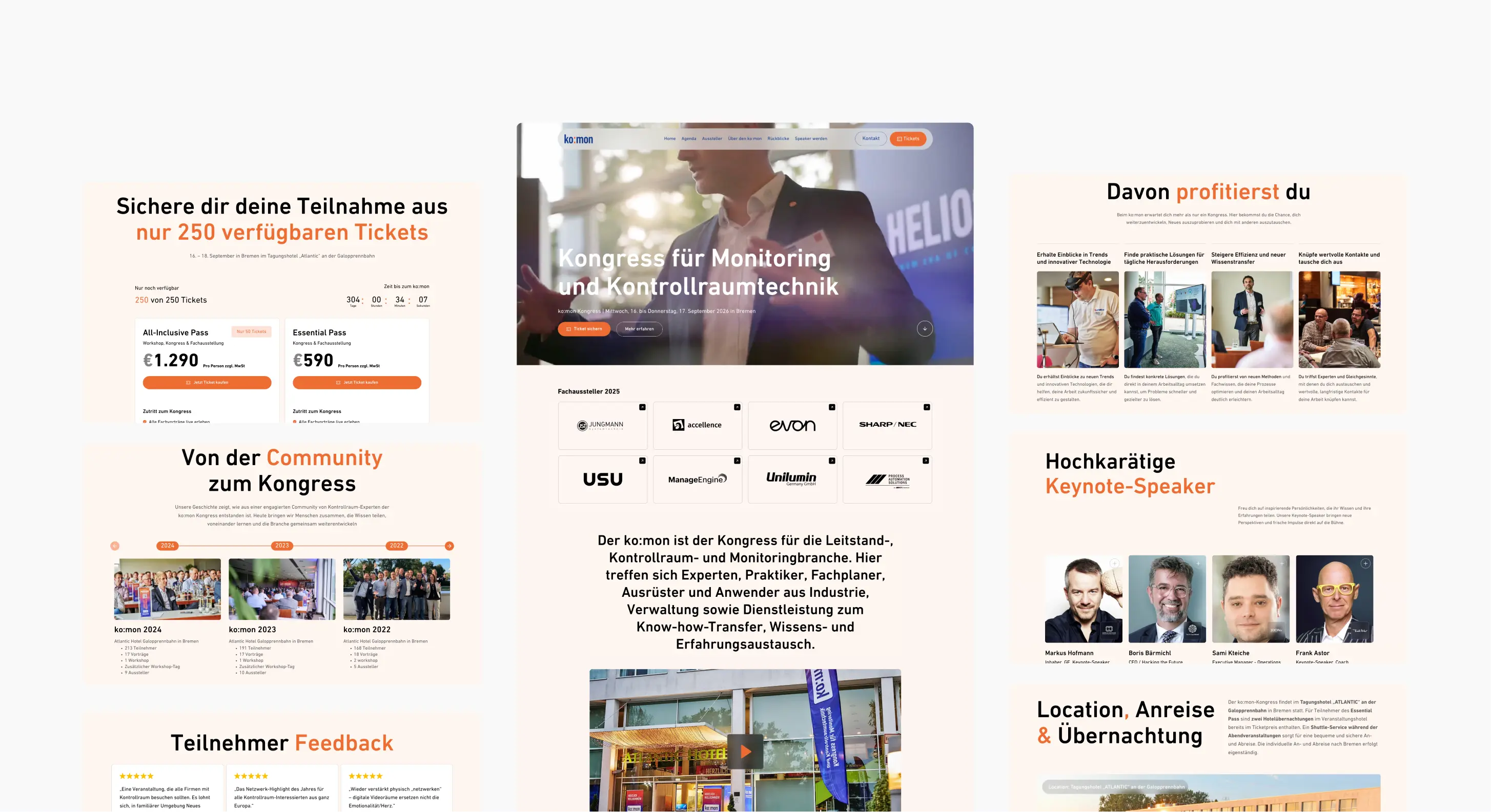 Wir erarbeiteten eine übersichtliche Sitemap und entwickelten eine conversionoptimierte Informationsarchitektur. Der Content wurde sorgfältig strukturiert und der visuelle Stil konsequent an der Corporate Identity des ko:mon-Kongresses ausgerichtet.