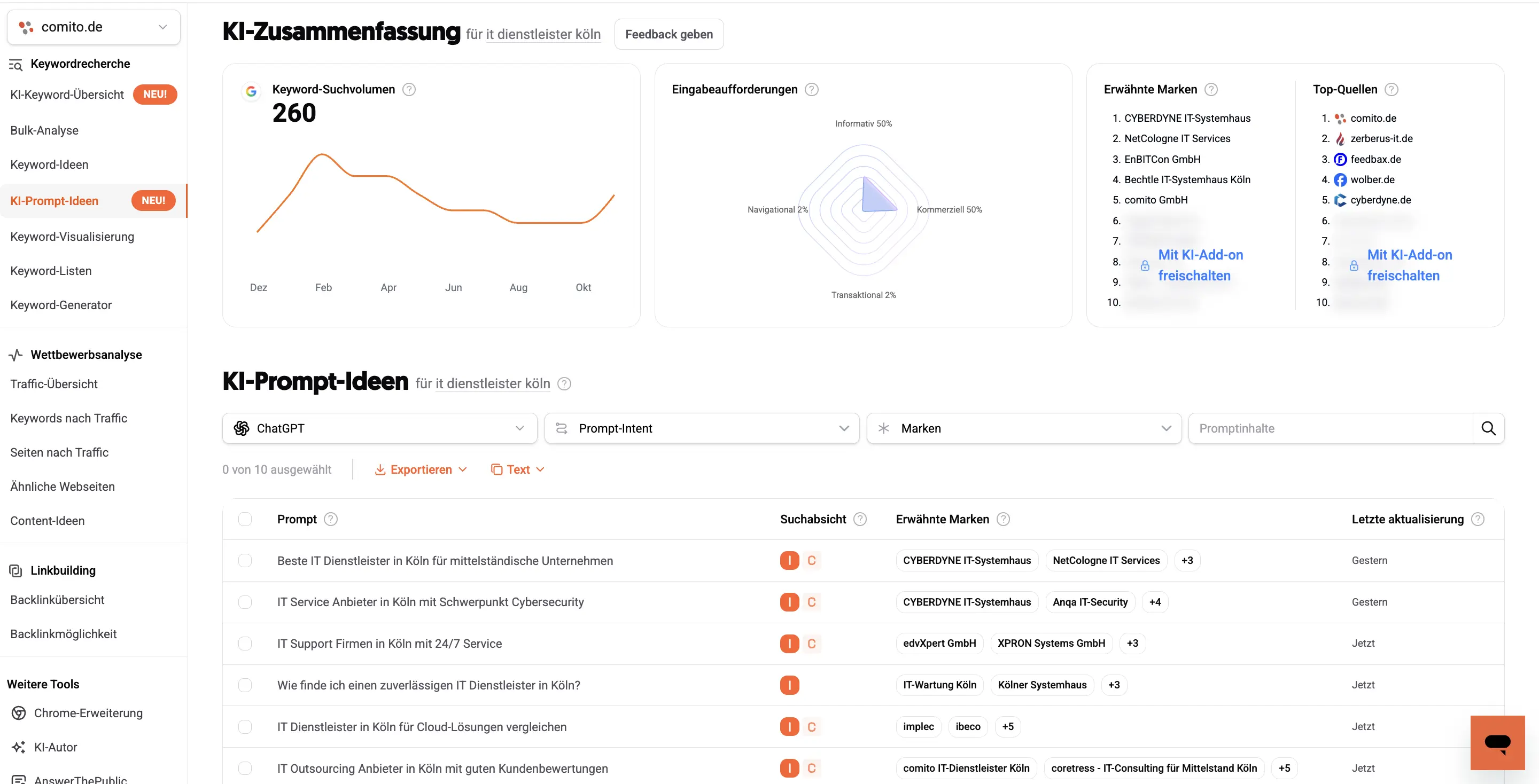 - SEO- und GEO-Analyse: Keyword-Recherche, SERP-Overlap, Wettbewerbs- und KI-Prompt-Analyse