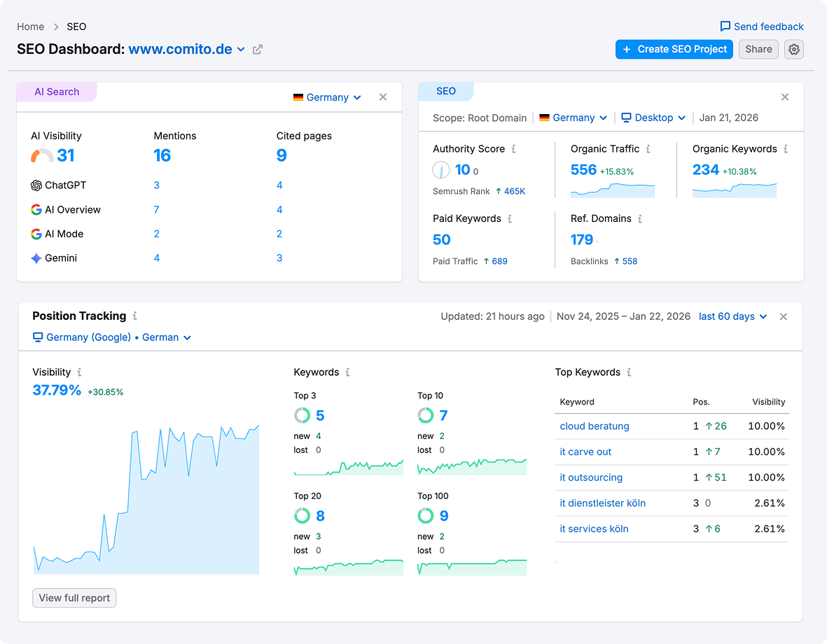 Die neue Website positioniert comito als führenden IT-Dienstleister aus Köln, ist SEO-stark und für KI-Systeme optimiert. Bereit für Dein Website-Upgrade? Kontaktiere uns jetzt für ein unverbindliches Erstgespräch und erfahre, wie Du durch SEO, GEO und einer conversionoptimierten Website Dein Neukundengeschäft aufs nächste Level hebst. Wir bringen Dich in die Sichtbarkeit und machen Deine Website unschlagbar! Jetzt Erstgespräch vereinbaren